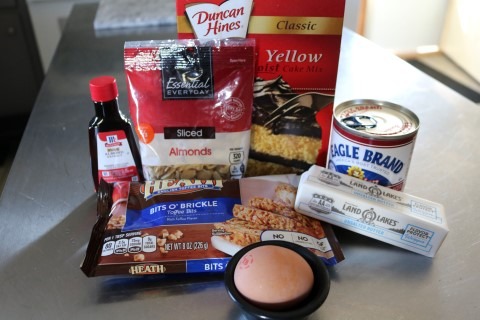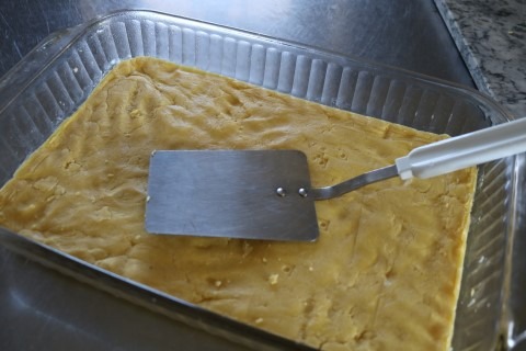 7. Spread the Toffee mixture evenly over the Cake Mix layer.