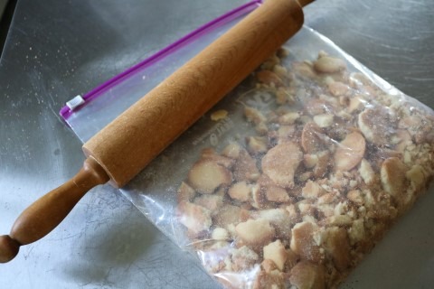 3. Crush the Cookies to make our topping. I put about 70 Cookies in a resealable plastic bag and use a rolling pin to to crush the Cookies. Get your frustrations out and give the bag a few whacks with the rolling pin.