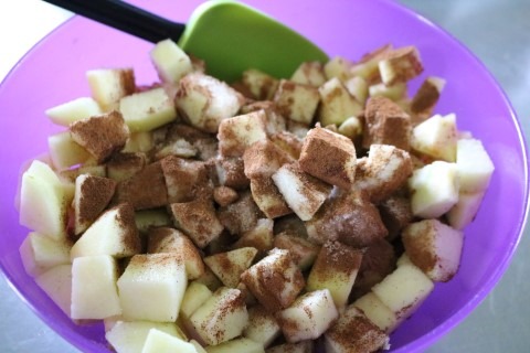 2. Place diced Apples in a large bowl and stir together with the Sugar, Cinnamon and Nutmeg. Set aside.
