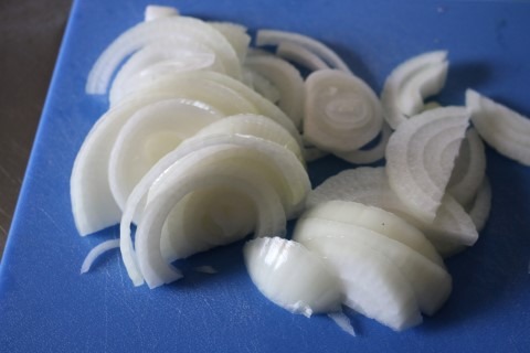 2. Slice Kielbasa into 1/2 inch round slices, set aside. Cut the Onion in half then cut into thin slices,set aside.