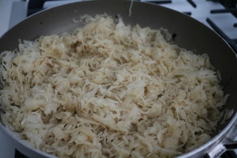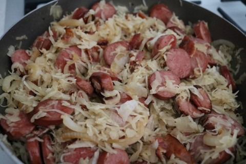 8. Add the Sauerkraut to the frying pan and pour the Chicken Broth mixture over the Sauerkraut and cook and stir for 2 minutes over medium heat, then add the Onions, Bacon and Polska Kielbasa back into the pan and stir well to combine.