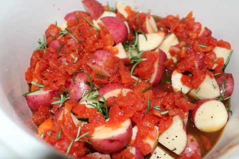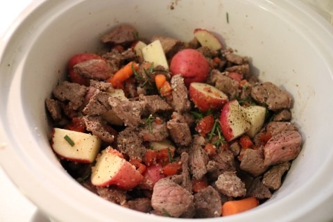 2. Add the Carrots, Red Potatoes, Tomatoes with juice, Tapioca, Beef Broth, Celery, Rosemary into the slow cooker. Don’t add the Peas or Onions just yet. Give your Pepper Mill a few good turns over all, then give everything a good stir.