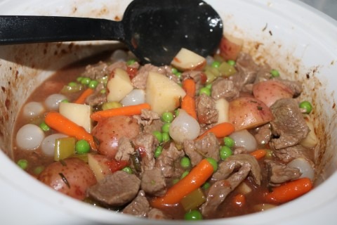 3. Set the slow cooker on Low and put the lid on. Cooking time will vary depending on your slow cooker. Newer slow cookers, cook at a higher heat and will take less time. If you have a newer slow cooker you may need a tad bit more Beef Broth as well. Check the Stew every few hours to ensure it is cooking properly. In my slow cooker, it took about 7 hours on low. So with that said, about half way thru the cooking time, add the Onions. The reason you don’t add them right away, is because they are ready to eat, you just need to heat them thru and marry the flavor in the Stew. This is also the time to add the Peas. The Peas are also precooked so you just need them to heat thru as well in the stew.