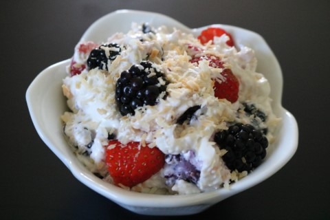 This Fruit Salad has the flavors of Cheesecake and the fresh Berries burst with flavor. A little toasted Coconut adds another flavor dimension to round out this delicious Fruit Salad.