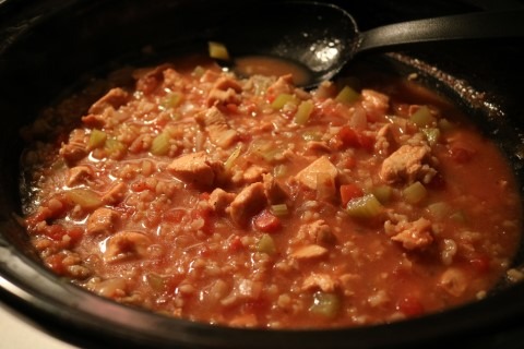2. Place the remaining ingredients, except the Rice, into the slow cooker. Stir to combine all the ingredients.