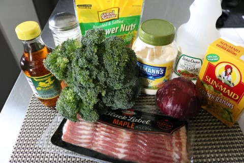 1. If some of your Broccoli Florets are a bit large cut them into bite size pieces then add the Broccoli, Red Onion, Golden Raisins, Sunflower Nuts and the Bacon into a large bowl. Set aside.
