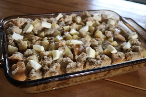 4. In a large mixing bowl, whisk together the Sweetened Condensed Milk, Evaporated Milk, Eggs, Vanilla, Cinnamon, Nutmeg and Cloves. Fold in the Bread Cubes and let all the liquid absorb into the Bread Cubes, then fold in the Apples.