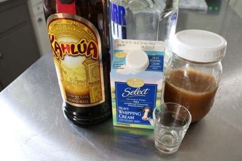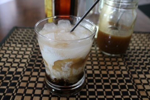 A White Russian Cocktail with a homemade Caramel Sauce.