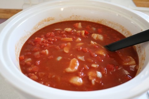 2. Next add the Tomato Juice, Chicken, Roasted Red Pepper, Canned Tomatoes, Montreal Chicken Spice and Pepper into a 6 or 7 quart slow cooker and stir all ingredients together.