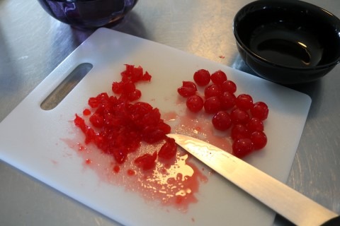 3. Drain the Maraschino Cherries and reserve the Juice. Cut the Maraschino Cherries into quarters, set aside.