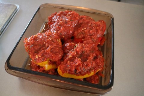 6. Stuff the Peppers with the Sausage Filling and place them in a baking dish.
