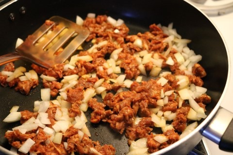 3. In a large skillet, brown the Sausage and sauté the Onions. I do this simultaneously in the same pan.