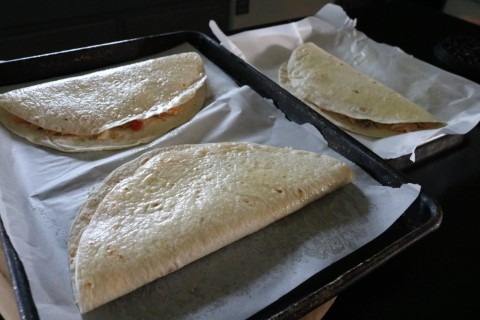 8. Bake the Chicken Quesadillas for 6-10 minutes. No need to flip them over, just watch for the Cheese to be melted and a slight golden color on the edges, and then the Quesadillas are done.