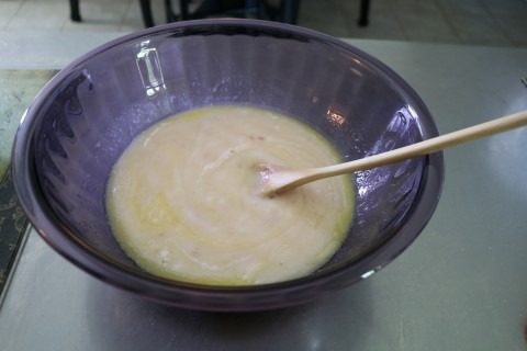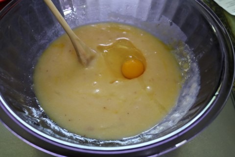 6. Now add 1 Cup of the Flour mixture to the Yogurt mixture, stirring well. Continue adding the Flour mixture 1 cup at a time and stirring well until all ingredients are combined as you see here.
