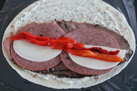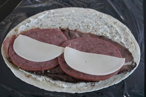 4. Layer 2 Slices of the Beef close to the edge, on the bottom side of the Tortilla as you see here. If your Beef slices are shorter than the length of the Tortilla than use an extra slice or two to fit the length.