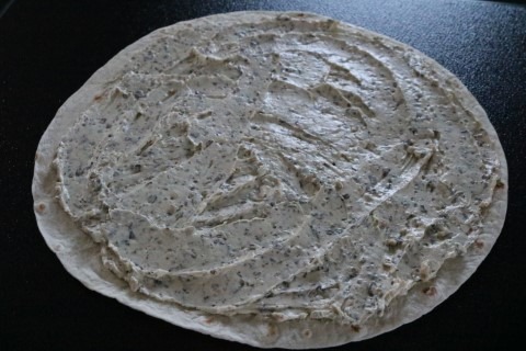3. Spread 1/3 of the Cream Cheese mixture, onto one Tortilla. Do not go all the way to the edge.