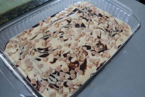 8. Now take a knife and swirl the Brownie Batter into the Cream Cheese layer as you see here. This will give us a marbled effect on top.