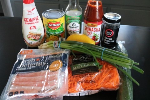 3. Add the Carrots, Cucumber, Mango and Green Onion into the bowl with the Crab Strands.