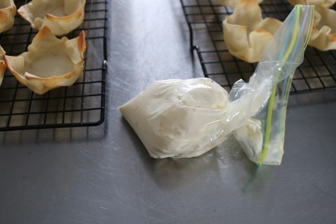 8. Time to fill the Wontons. Place about 1 cup of the Cream Cheese mixture into the corner of a sandwich style plastic bag. Twist to remove any air and snip the corner tip of the bag. This works just like a pastry bag to fill the Wonton cups. This is just the first layer so pipe about 1 Tablespoon into each cup and try to get into the corners. Refill the bag and continue piping until all the Wonton Cups are filled.