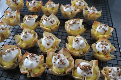 9. The second layer will be the Lemon Filling. Place about 1 cup of the Lemon Filling into the corner of a sandwich style plastic bag. Twist to remove any air and snip the corner tip of the bag. This works just like a pastry bag to add the second layer into the Wonton Cups. Pipe a layer of Lemon Filling on top of the Cream Cheese Layer using about 1 Tablespoon of filling per Wonton Cup. Refill the bag and continue piping until all the Wonton Cups are filled.