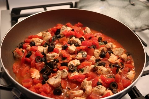 5. Reduce heat to simmer and then add the Chicken and Garlic, Basil and the Black Olives into the skillet. Give everything a good stir.
