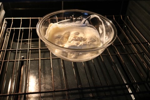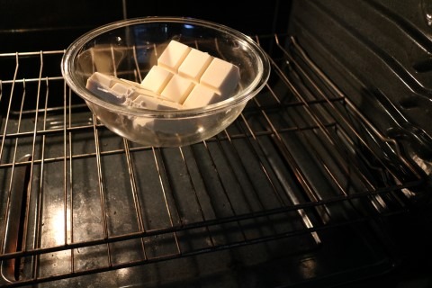 9. While the Egg shapes set up in the freezer, melt the Almond Bark. I like to use the oven method for this recipe. Simply place the Almond Bark in an oven safe bowl, then put the bowl into the preheated oven. Check the Bark every few minutes and give it a good stir until it is completely melted and smooth.