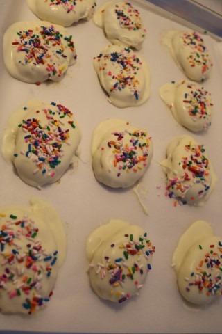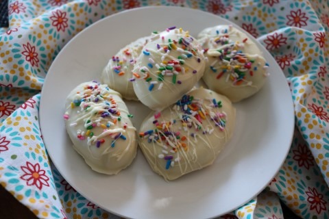 11. Carefully dip the Eggs into the melted Almond Bark. To do this just balance the Egg on a fork and lower it into the melted Bark, make sure to coat all sides of the Egg. Lift the fork and let the excess Almond Bark run off and back into the bowl, then place the dipped Egg back onto the parchment lined cookie sheet and add the Sprinkles on top. Continue until you have all the Eggs dipped with Sprinkles added on top.