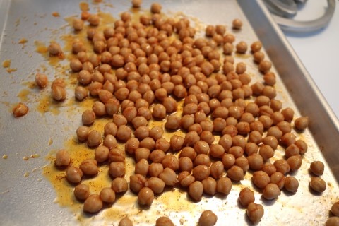 5. Spray a large baking sheet with non-stick cooking spray. Transfer the Chickpeas to the baking sheet.