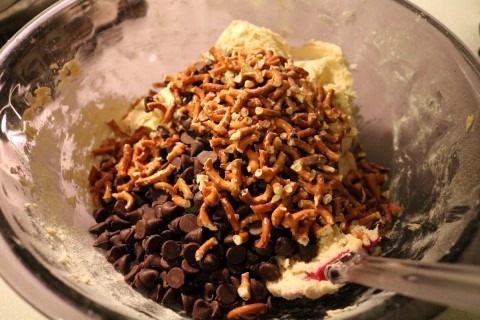 6. Scrape the sides of the bowl and when the Cookie dough has all come together, stir in the Chocolate Chips and the Pretzel Pieces.