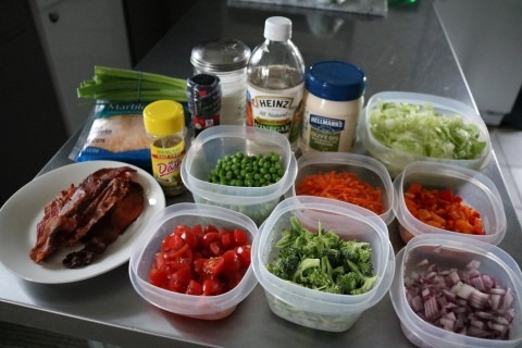 2. Next layer with half of the Red Pepper, Diced Bacon, Red Onion, Tomatoes, Carrots, and the Peas. Then sprinkle 1/2 Cup of the Cheese on top of the Veggies. Repeat with a second layer of the remaining Lettuce and Broccoli followed by the remaining Veggies. The remaining Cheese will go on after we add the Dressing.