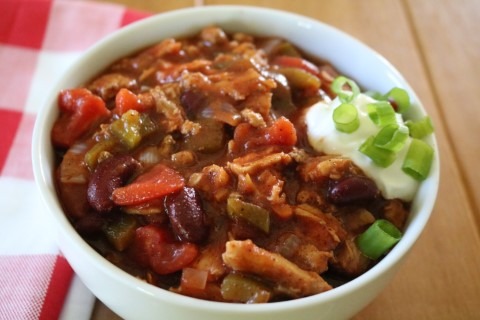 Serve the Chili with Sour Cream, Grated Cheese and diced Green Onions on the side.