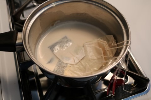 3. In a small saucepan, add the Half and Half. Over a medium heat, warm the Half and Half. DO NOT BOIL. Look for bubbles to just begin to form at the edges then remove from the heat. Now dunk the 8 Tea Bags into the warm Half and Half. Let the Teabags steep in the Half and Half for about 3-4 minutes. Then squeeze out the liquid, from the Tea Bags, back into the saucepan. Let the Tea infused Half and Half cool for about 15-20 minutes.