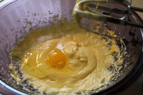 5. In a large mixing bowl, cream 1/2 Cup of the Butter and Sugar using a handheld mixer. Then add in the Eggs one at a time mixing until well combined.