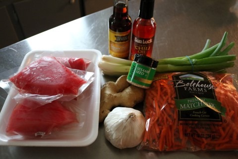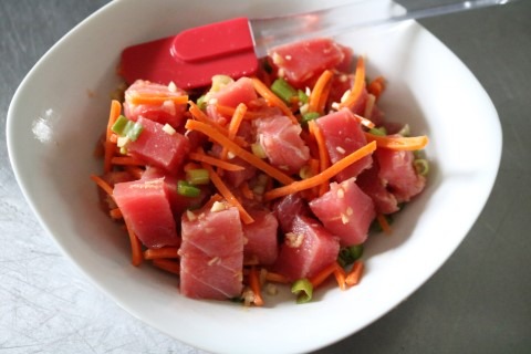 4. Add the Carrots, Green Onion, Ginger, Garlic, Sesame Oil and Hot Chili Oil to the bowl with the Tuna. Fold everything together ensuring everything gets coated.