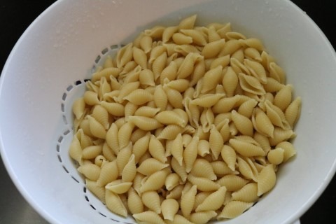 4. Once the Pasta is done, pour the Pasta into a colander and rinse under cold water to stop the cooking process, then thoroughly drain the Pasta.