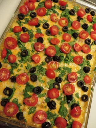 A colorful Casserole with cheesy, bold taco flavors. This Hot Dish is a lot easier to serve and less messy than Tacos. If you grow Tomatoes, Cilantro, Red Peppers and Jalapeno Peppers in your garden, like I do, this is a great Hot Dish…
