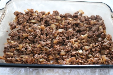2. In a large frying pan, brown the Beef and cook the Onion until tender, at the same time, in the same pan. Drain any excess fat out of the pan. Transfer the Beef and Onion into an 11 x 8 baking dish. Spread the Beef and Onion mixture out evenly in bottom of the dish.