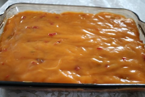 4. Evenly spread the Fiesta Nacho Soup over the Corn.