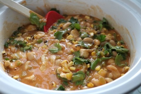 6. Reduce the heat to low and stir in the Chicken, Peppers, Onions, Beans, Corn and Green Chilies. Cover and simmer over low heat for about 45 minutes, stirring occasionally. This will allow the flavors to marry and will heat the Chili through. After 45 minutes, stir in the Cilantro and cook another 10-15 minutes with the lid on.
