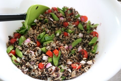 2. In a large bowl combine the Wild Rice, Tomatoes, Sugar Snap Peas, Basil, Red Onion and the Parmesan Cheese. Set aside.